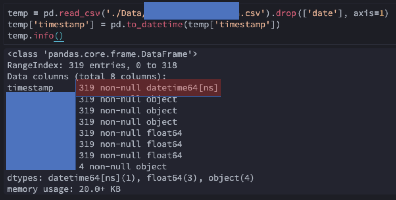 따라서 다음과 같이 datetime으로 변환을 하고, 다시 info함수를 쓰면, 기존의 timestamp column이 datetime형식으로 바뀐걸 볼수가 있다.