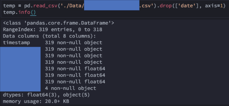 먼저 데이터를 불러읽은다음에 info함수를 사용하여 column들의 정보를 빼온다.
